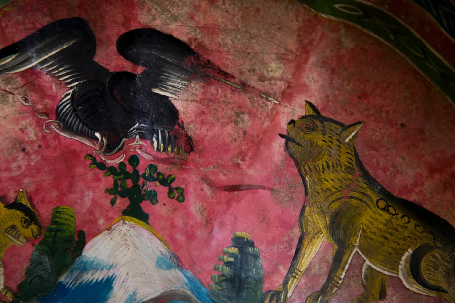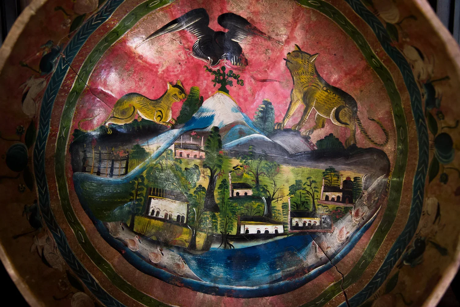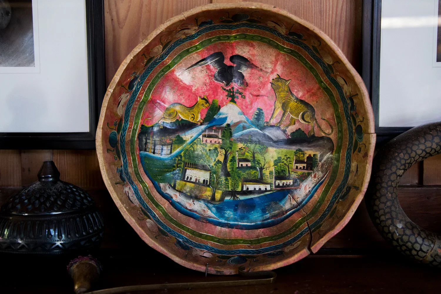 This bowl is a piece of Mexican vintage folk art acquired by Edward in Oaxaca, Mexico in 1925. Perhaps a drinking bowl used for drinking water, atole, or other juices. The designs are beautifully presented with vibrant colors showing an eagle atop a city upon a mountain and what appears to be some form of dog and cat.