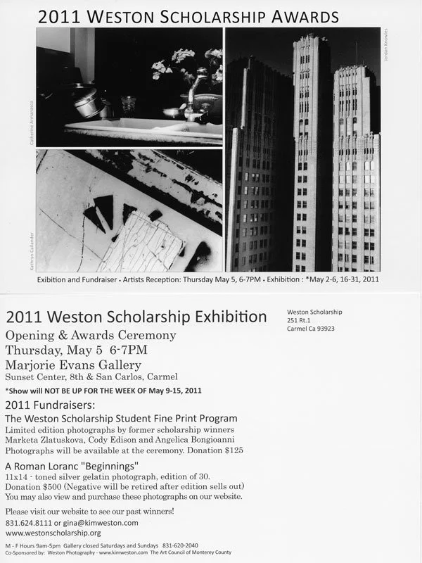 Weston Scholarship “ Recognizing the Alumni” ExhibitionMarjorie Evans Gallery Opening Thursday, May 5, 5-7PM 9th and San Carlos St Carmel, CA Exhibit Dates: May 3 - 31, 2016 The WS will be showcasing prints from “The Weston Scholarship Portfolio," a beautiful collection of top winning Alumni photographs collected over the past 12 years. Joining the Alumni will be local photographers, Kim Weston, Roman Loranc, Huntington Witherill, Ryuijie, Chuck Davis, Kevin Bransfield, Greg Mettler, Claire Lerner, Jerry Takigawa, Cole Thompson, Jim Kasson, Brian Taylor and Rick Murai. The contributions from this supporting group of professional photographers comes in many forms, from teaching our students in our local schools and darkrooms, donating money to our fund, to donating prints to our fine art auction fundraisers. We are proud of our program and hope you will enjoy the show that we are bringing to you.